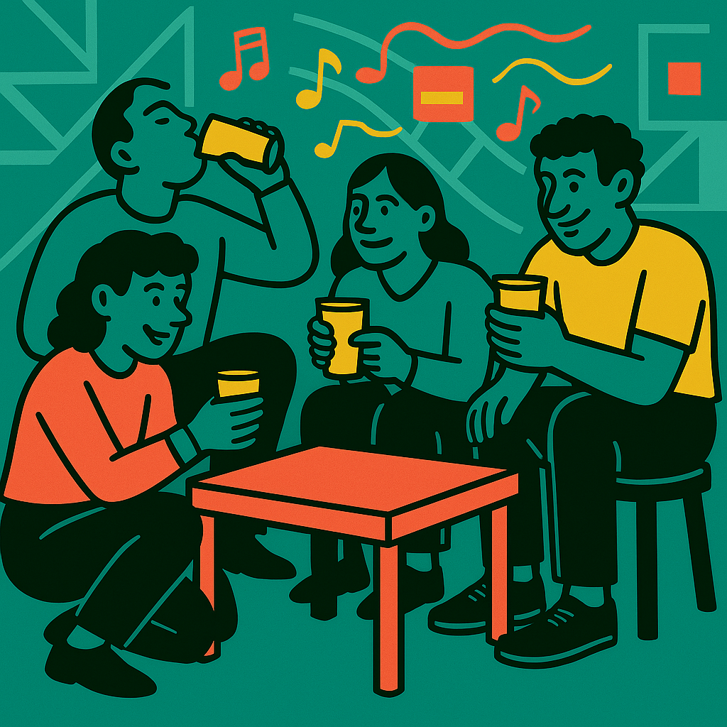 Den ultimata drickkedjereaktionen. Drick efter den före dig när låten når ett specifikt ord. Håll kaskaden flödande!