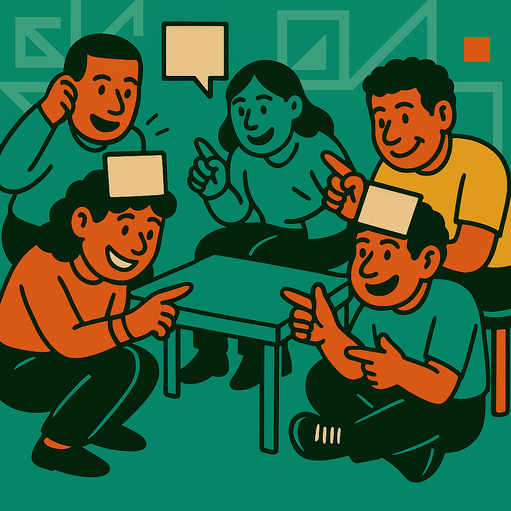 Vem eller vad är du? Varje spelare får en hemlig etikett med en person, sak eller koncept som ni väljer. Ställ ja- och nej-frågor till de andra för att lista ut din egen etikett. Först att gissa vinner